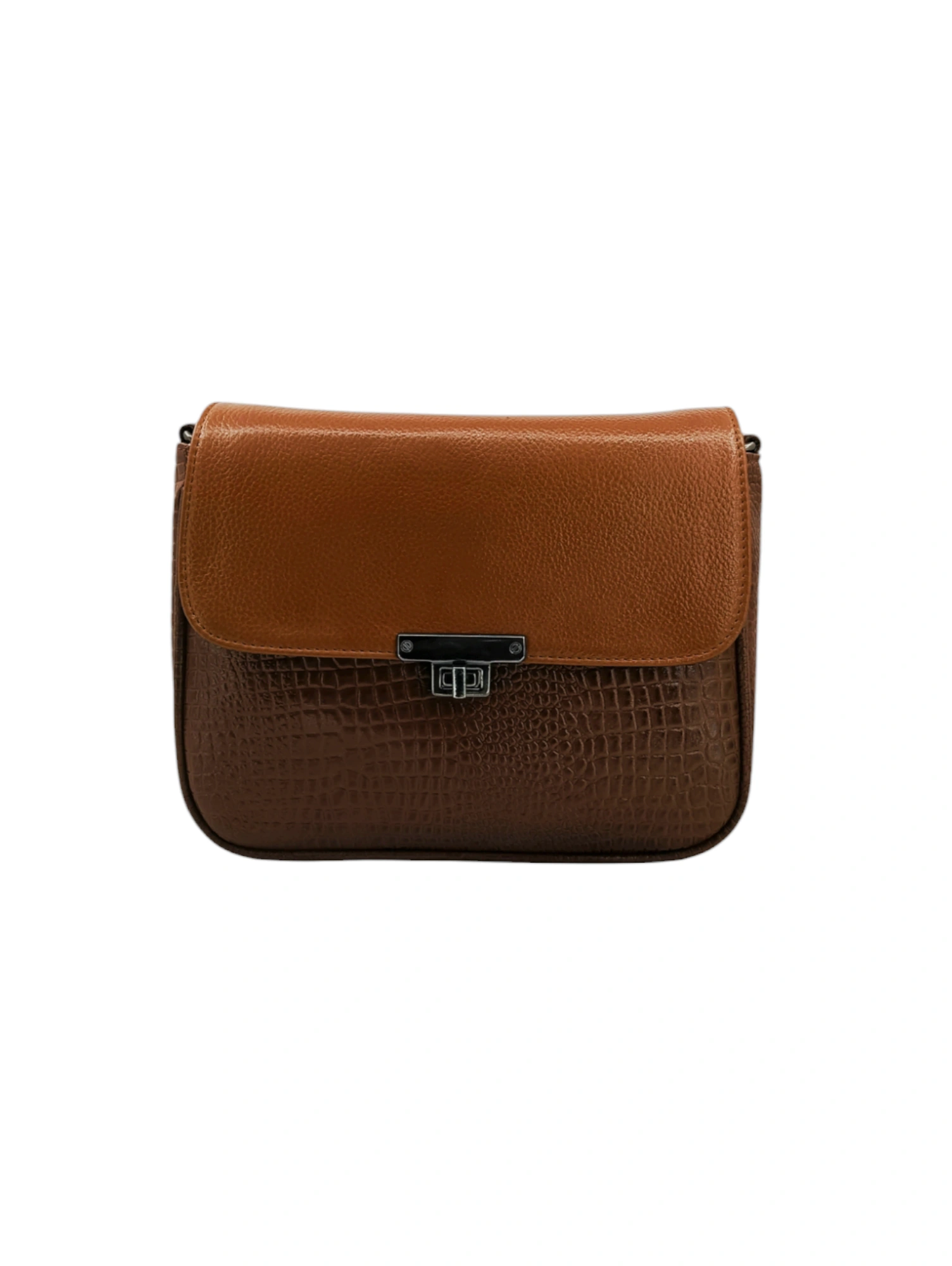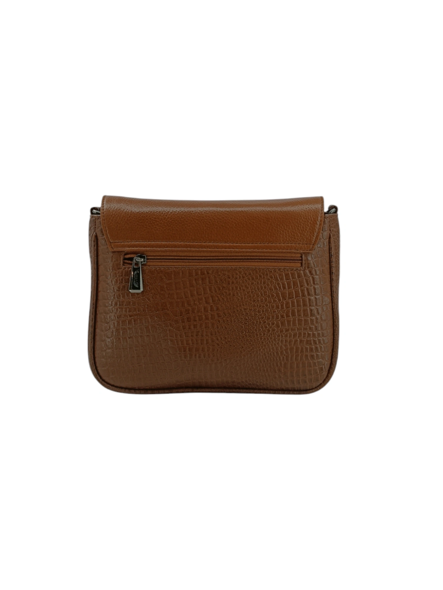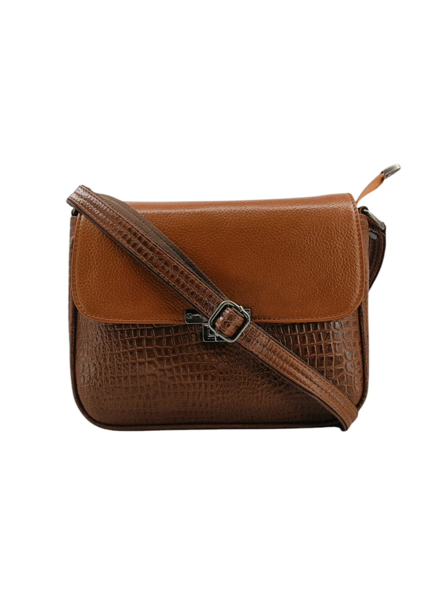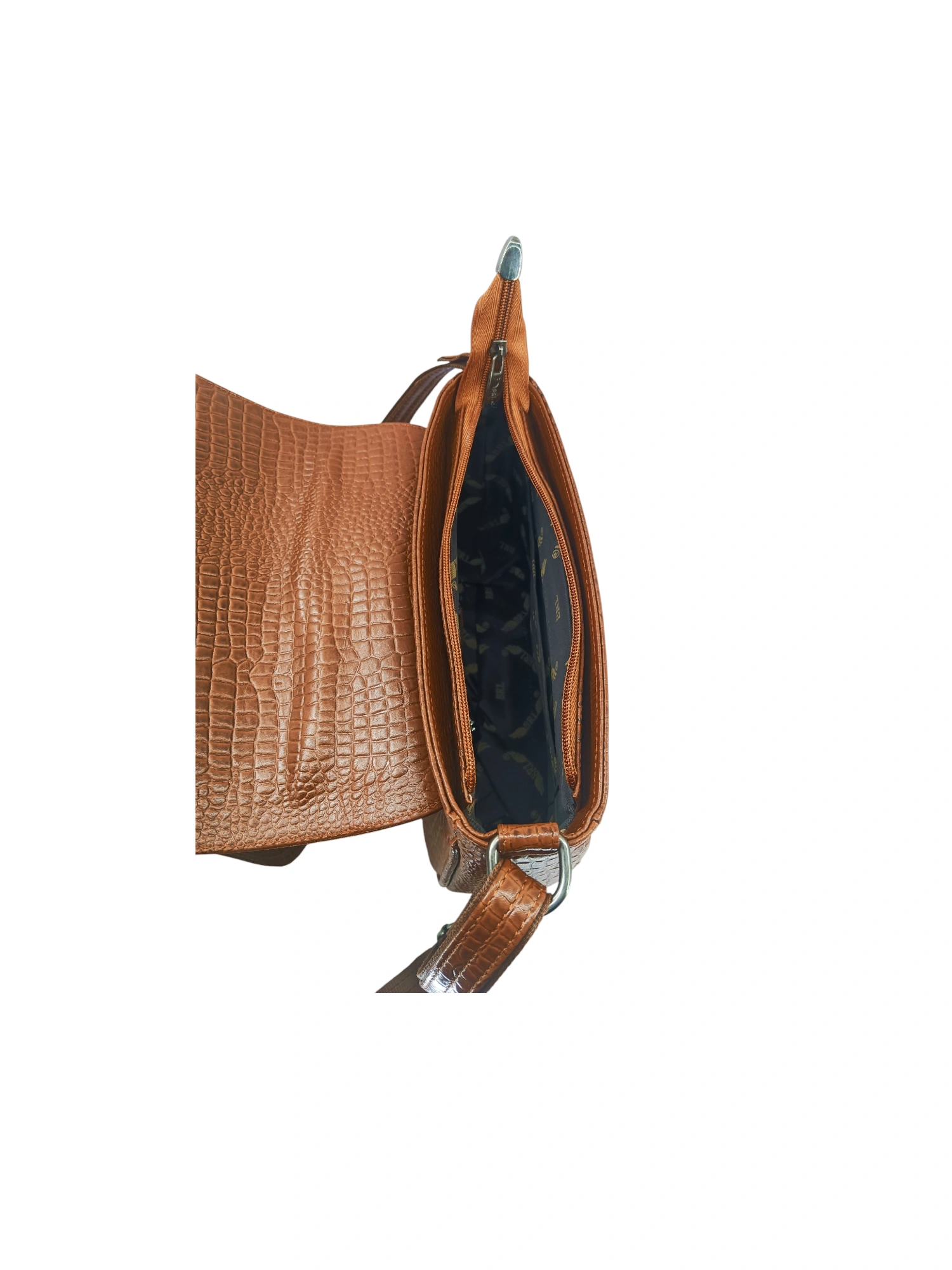 Crafted from genuine leather with a rich tan finish, this bag features a flap and zipper closure for security and convenience. The 1 main large zippered compartment, 1 back zip pocket, and inner mesh pockets provide multiple storage options to keep your belongings organized. The 55-inch adjustable strap allows for comfortable crossbody or shoulder carrying.